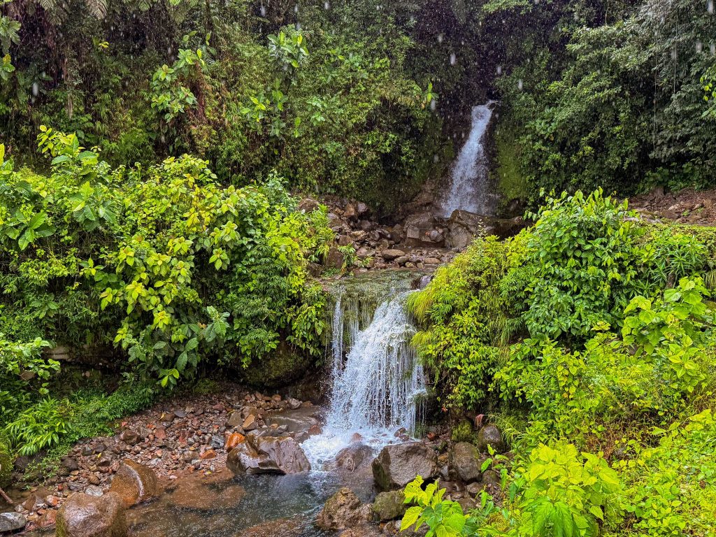 Najtrudniejszy fragment to podejście do trzeciego wodospadu, jest zdecydowanie nie dla każdego. Wejście po linie jest jeszcze do ogarnięcia, ale zejście, zwłaszcza gdy zacznie padać, staje się dużym wyzwaniem. W moim przypadku deszcz złapał nas w drodze do trzeciego wodospadu, na szczęście nie był zbyt intensywny. W porze deszczowej warunki mogą być naprawdę trudne i wtedy lepiej odpuścić ten odcinek – błoto robi się śliskie, a na trasie nie ma zasięgu.